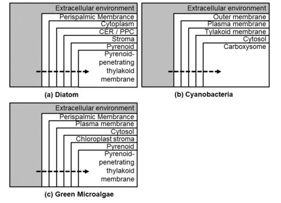 107. Tsuji, Y.; Nakajima, K.; Matsuda, Y. Molecular Aspects of the Biophysical CO2-Concentrating Mechanism and Its Regulation in Marine Diatoms. J. Exp. Bot. 2017, 68, 3763–3772. [Google Scholar] [CrossRef] [PubMed]