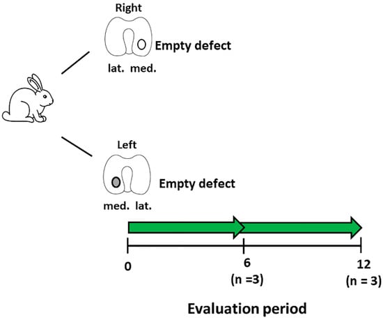 The in vivo study was conducted on skeletally mature New Zealand white rabbits (5–6 months old) using procedures approved by our local ethics committee (Regierung von Unterfranken, 55.2 2532-2-300, approval date: 23 December 2016). The rabbits were anesthetized using a combination of 0.6 mL/kg ketamine (10%) and xylazine (2%), applied intramuscularly into the rabbit. The first animal study involved the development of a focal early OA model for the evaluation of cell-based therapies. Following anaesthesia, the medial femoral condyle was exposed through a medial parapatellar incision with the patella dislocated to the lateral side. A 2.3 mm diameter (2 mm deep) defect was created on the medial condyle using a handheld dental drill (Surgic Pro, NSK Europe, Eschborn, Germany). The patella was placed back into position and then skin was closed using sutures. A second defect was created on the contralateral medial femoral condyle using the same procedure (Figure 1).