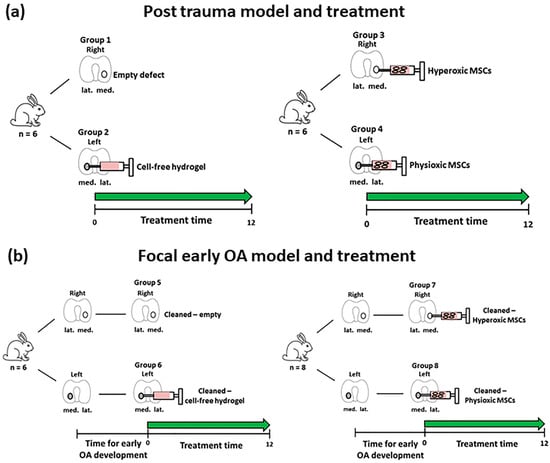 In the case of MSC treated defects for both models, autologous rabbit MSCs (passage 2; n = 26, including donors from the in vitro study (Section 2.2)) isolated from bone marrow were pre-expanded in parallel under either hyperoxia or physioxia (see Section 2.2). MSCs were counted using a haemacytometer and seeded into the hydrogel at a density of 50 × 106 cells/mL according to a previously described protocol [32]. The cell seeding density was based on previous in vivo experiments using MSCs for cartilage repair in animal models [33,34]. MSC-hydrogels were injected into the defect (approx. 20 μL) with one medial femoral condyle treated with physioxic MSCs, whilst the contralateral medial femoral condyle had hyperxoic MSCs applied (Figure 2). Prior to joint closure, all hydrogel groups were allowed to gel for five minutes and joint motion was used to observe whether hydrogel remained in the defect. For post-trauma defects, hyperoxic MSCs (Group 3; n = 6) and physioxic MSCs (Group 4; n = 6) were immediately injected following defect creation (Figure 2a). In the focal early OA model, hyperoxic (Group 7; n = 8) and physioxic (Group 8; n = 8) MSCs were applied in a second surgery, following the designated period time for focal early OA development (Figure 2b). All rabbits were put back into their individual cages with no restrictions on movement. Prior to these experiments and to evaluate whether hydrogel remained within the defect, a pilot study was conducted, whereby defects were created on both knees as described and then immediately implanted with cell-free hydrogel. The rabbits were euthanized at 12 weeks post-MSC implantation for the respective model (for the pilot study, only 1 week post hydrogel application) by an intravenous overdose application of narcoren (0.5 g/kg).