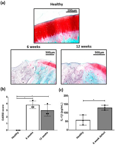 Representative (a) safranin-O/fast green stained healthy, 6 and 12 week defects used for the examination of focal early OA in the defect. (b) OARSI score for healthy, 6 and 12 week defects post-surgery and (c) measurement of IL-1β in cartilage from healthy and defect cartilage. Data represent mean ± S.D.; n = 3, with dots representing the mean from three blinded scorers (five sections per defect). * p < 0.05.