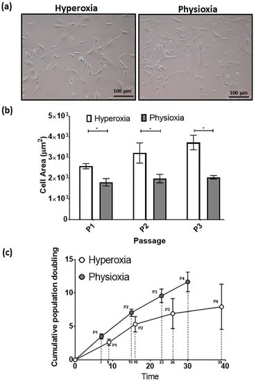 The typical MSC fibroblastic morphology was observed under both oxygen tensions, with MSCs cultured under physioxia appearing to be smaller (Figure 4a) [37]. Measurements of individual MSCs demonstrated that physioxic MSCs were significantly smaller than hyperoxic MSCs (p < 0.05; Figure 4b). Furthermore, hyperoxic MSCs increased their cell area with passage, whilst physioxic MSCs remained the same. An analysis of their cellular proliferation over four passages in culture, showed that physioxic culture resulted in greater MSCs numbers and significantly shorter population doubling times between passages relative to hyperoxia (* p < 0.05; Figure 4c). In the case of hyperoxic MSCs, there was a cessation of cell growth after approximately 30 days in culture in the majority of donors, whereas physioxic MSCs continued to expand at the same rate for all donors (Figure 4c).