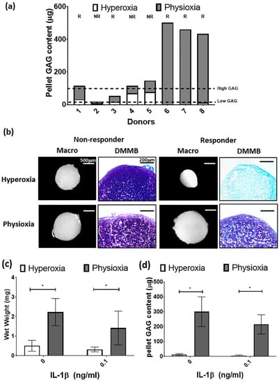 For the purpose of the subsequent in vivo studies, MSC chondrogenesis was performed for donors under their expansion conditions to evaluate their response to physioxia. There were donors either responsive (R) or non-responsive (NR) to physioxia based upon their pellet GAG content (Figure 5a). A physioxia responsive donor is one where there was a 2-fold increase in pellet GAG under physioxa relative to hyperoxia, whereas a non-responder was one that a had a less than 2-fold increase [23]. Additionally, these responsive donors had a low intrinsic baseline chondrogenesis under hyperoxia [22]. Histological evaluation of non-responsive donors showed pellets of similar size and DMMB staining intensity. In contrast, physioxia responsive donors had larger pellets and greater DMMB staining intensity under physioxia compared to hyperoxic cultures (Figure 5b). Analysis of only physioxia responsive donors demonstrated a significant increase in pellet wet weight (* p < 0.05; Figure 5c) and GAG content (* p < 0.05; Figure 5d) under these conditions, when compared to hyperoxic culture. In the presence of IL-1β, a decrease in pellet wet weight and GAG content was observed under hyperoxic conditions. However, the corresponding physioxic condition, demonstrated a significant increase in pellet wet weight and GAG content compared to equivalent hyperoxic cultures (* p < 0.05; Figure 5b,c).