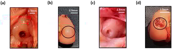 Macroscopic image of (a) empty defect immediately after creation and at (b) 6 weeks (defect cricled) post-surgery. (c) Cleaned defect prior to hydrogel implantation and (d) presence of hydrogel (black circle) in defect after one week in the joint.
