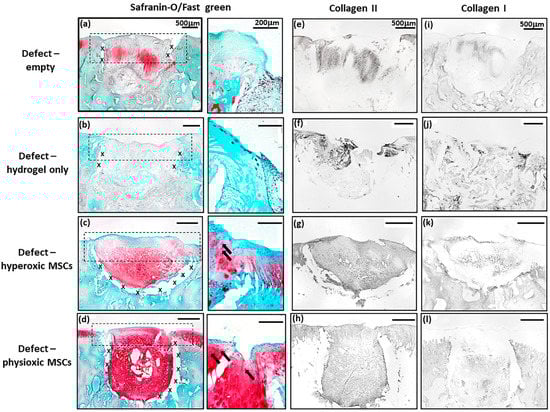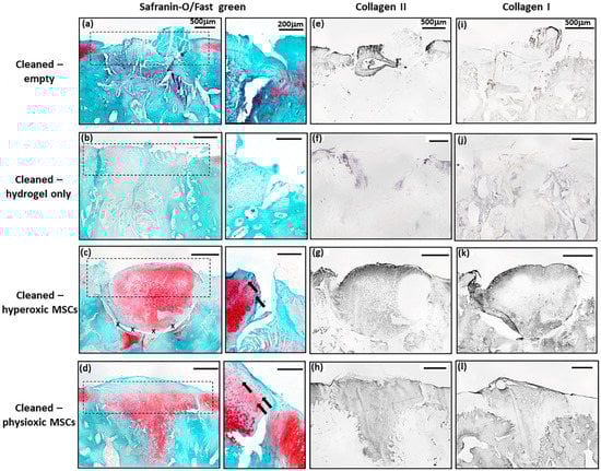 MSC treated defects had cartilaginous tissue formation with safranin-O and collagen II staining within the treated region. Application of physioxic MSCs induced greater safranin-O and collagen II staining (Figure 7d,h) with hyperoxic (Figure 7c,g). Furthermore, there was evidence of more chondrocytes and early column formation in the cartilage layer upon application of physioxic MSCs relative to hyperoxic MSCs (Figure 7c,d). In contrast, empty and cell-free hydrogel defects had fibrocartilaginous tissue with minimal safranin-o staining (Figure 7a,b) and only collagen II (Figure 7e,f) and I (Figure 7i,j) present.