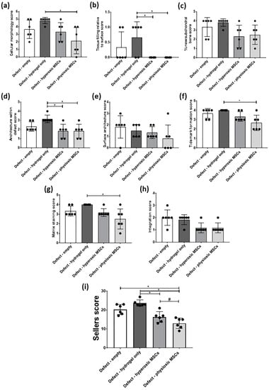 The total Sellers score was found to have a lower score for MSC treatments compared with empty and cell-free hydrogel treated defects. Both hyperoxic and physioxic MSCs showed a significant improvement in the score compared to the controls (* p < 0.05; Figure 8i). Furthermore, physioxic MSCs resulted in a significant improvement in tissue regeneration, compared with hyperoxic MSCs (# p < 0.05; Figure 8i).