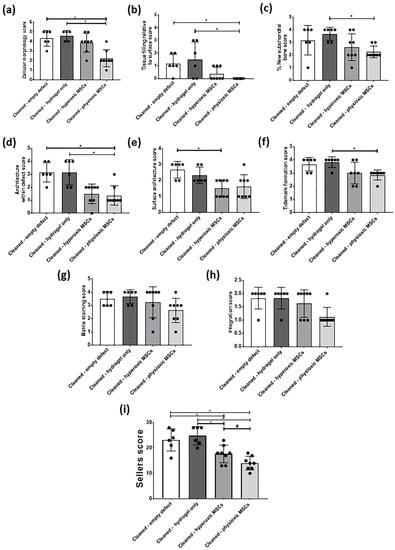 There was found to be a significant reduction in Sellers score with MSC presence, independent of expanded oxygen tension compared to controls (cell-free hydrogel and empty) (* p < 0.05; Figure 10i). A pairwise comparison of MSC therapies showed a significant improvement using physioxic MSCs (# p < 0.05; Figure 10i).