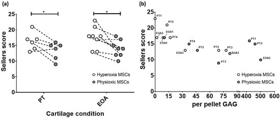 (a) Dot plot describing paired comparison between physioxia and hyperoxic MSCs treatment in post-trauma (PT) and focal early OA (EOA) models (* p < 0.05). (b) A dot plot depicting the relationship between per pellet GAG and subsequent Sellers score outcome for the treated defect. PT signifies post trauma model and EOA represents focal early OA model with respective animal number given.