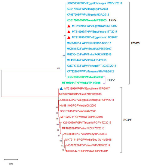 Phylogenetic Neighbor-Joining tree of the APV P4b gene sequences with 1000 repeats bootstrap. The tree separated into 2 clades: clade 1, in which the isolates mans17F (FWPV), mans17T (TKPV), and mans17C (CNPV) identified in this study (red triangles) are aligned with FWPVs and TKPVs obtained from GenBank. Clade2, in which the mans17P (PGPV) isolate identified in this study (blue triangle) is aligned with PGPVs retrieved from GenBank.