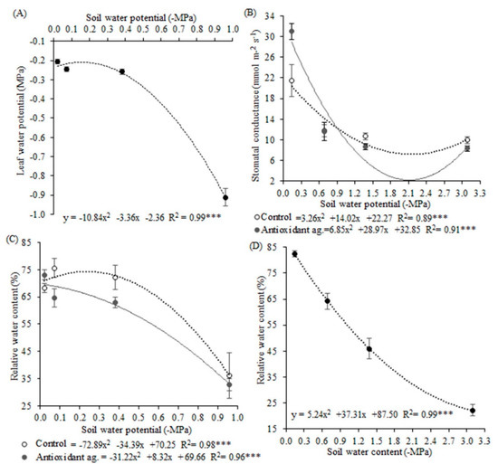 More gas exchanges were observed for the plants under the highest soil water potential (−0.14 MPa), which presented stomatal conductance values 60% higher than plants in the other soil water potentials (Figure 1B). In this highest potential, the plants treated with the antioxidant agent presented 0.3-fold increases in stomatal conductance in comparison to the control.