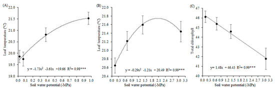Leaf water potential presented a response with quadratic behavior, and 99% of the variation was explained by the soil water potential (Figure 1A). The leaf water potential had variations of −0.21 MPa, for the soil water potential of −0.02 MPa, up to −0.91 for the soil water potential of −0.96 MPa. Leaf water potential in the lowest soil water potential (−0.96 MPa) was 75% lower than the other potentials, which did not themselves differ significantly.
