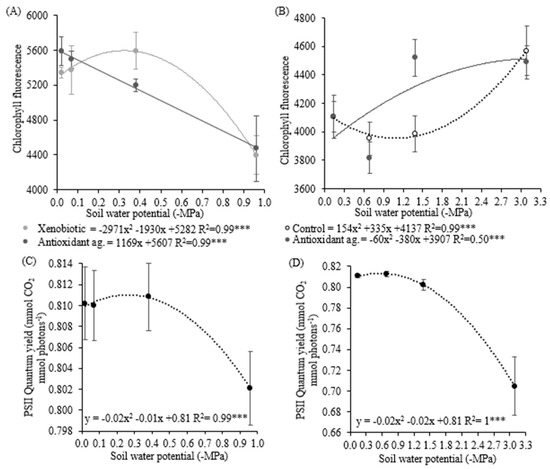 Chlorophyll fluorescence in the first experiment (A) and the second experiment (B), quantum yield of photosystem II in the first experiment (C), and the second experiment (D) in soybean plants under different soil water potentials, and xenobiotic and antioxidant agent application. Note: asterisks indicate error probability as * = 10%, ** = 5%, and *** = 1%, respectively. Vertical bars represent the standard error of the samples.