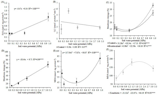 Membrane damage (MD) presented increasing quadratic behavior in the first experiment (Figure 4C). The soil water potential explained 99% of the variation in the control and 100% of the variation in the antioxidant agent treatments. In the lowest soil water potential, membrane damage was 50% higher, compared to the other potentials, and more damage was observed to the antioxidant agent-treated plants. In the second experiment, the highest MD was observed in soil water potential of −3.09 MPa, which was 66% higher than the other potentials, which did not differ from each other (Figure 4D). The increase was linear, and 99% of the variation was explained by the soil water potential.