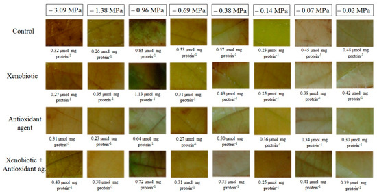 In situ detection of H2O2 showed that the production of this ROS was higher in conditions of more severe stress (lower soil water potentials) (Figure 5). Leaves of the plants grown in soil water potential of −0.96 MPa showed the highest number of brown spots, indicating more sites with the H2O2 presence. Plants treated with a xenobiotic, alone or in combination with the antioxidant agent, also presented higher spots, demonstrating a higher concentration of H2O2 in plant cells, while the plants treated only with the antioxidant agent showed a marked reduction in the spots, indicating a lower production of H2O2.