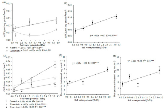 In the first experiment, the APX activity was reduced by the xenobiotic in all soil water potentials, except for −0.02 MPa (Figure 6A). In the second experiment, APX was increased in lower soil water potentials, in a linear behavior, with 97% of the variation explained by soil water potentials (Figure 6B). In the second experiment, CAT activity increased linearly in the control, xenobiotic, and xenobiotic + antioxidant agent plants (Figure 6C). The interaction table shows that when plants did not receive a xenobiotic application, CAT activity was higher without an antioxidant agent in −3.09, −1.38, and −0.69 MPa (Table 11). This enzyme activity was increased with the xenobiotic and without the antioxidant agent in −3.09 and −0.69 MPa plants.
