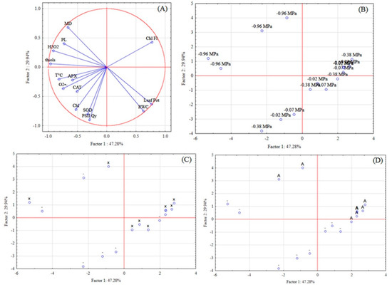 The PCA was performed to found the variables that more explained the variations found in the interactions studied in this work. Therefore, the analysis of the experiment I resulted in 2 factors with eigenvalues higher than one, which resulted in a cumulative 77.218% of the cumulative variance of all analyzed variables (Table 13). Factor 1 is composed of leaf water potential, leaf temperature, chlorophyll fluorescence, H2O2, O2•−, lipid peroxidation, and non-protein thiols; Factor 2: chlorophyll, RWC, PSII quantum yield, and SOD (Table 14).