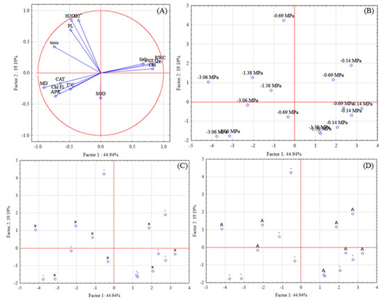 Thus, the antioxidant agent may have been essential for stress signaling by the ROS, which may have contributed to an increase in the activity of the antioxidant machinery and a reduction in the production and harmful effects of ROS. However, studies such as that of [74] only recognize H2O2 as a secondary messenger, considering O2•− only as a precursor of H2O2 and not a direct participant in signaling. It could also be supposed by the multivariate analysis that the defense mechanisms, like the catalase enzyme and the glutathione (thiols) can be activated by the antioxidant agent, which minimized the damage. The ROS may be the result of combined stresses, such as ROS or as signaling molecules that allow the early perception of stress.