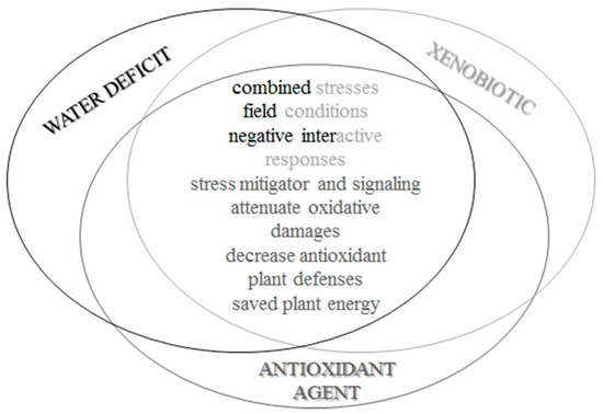 We concluded that soybean plants under water deficit for six and eight days in a controlled environment were subjected to oxidative stress, by the increased ROS production, cellular and molecular damages, and induction of defense antioxidant metabolism. In addition, the plants, presented physiological changes, such as the reduction of gas exchange, water status, and photosynthetic efficiency. The xenobiotic application also caused changes in oxidative metabolism. Negative effects were more pronounced when the xenobiotic application occurred in low soil water availability. This indicates that responses triggered from concurrent stresses are different from those triggered by isolated stresses, being observed negative interactive responses for these stressors combinations, and the most deleterious effect probably caused by water deficit. Antioxidant agent application was favorable for attenuating the effects of water deficit and xenobiotic application in soybean plants (Figure 9). We suggest the potential of −0.9 MPa for the water potential of the leaf and soil as a limit for the application of xenobiotics, or if it is necessary to apply in more severe conditions, an alternative is the addition of the antioxidant agent that showed a potential for reducing cellular and oxidative damages in soybean plants.