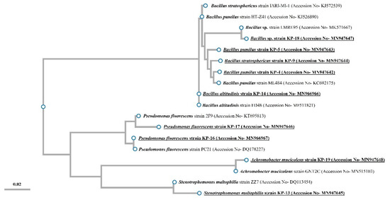 The partial 16S rDNA sequences of the isolates were compared with sequences available from the National Center for Biotechnology Information (NCBI; USA; http://www.nvbi.nlm.nih.gov) nucleotide nr/nt (non-redundant nucleotide) database to identify the nearest taxa. Multiple sequence alignments were performed using ClustalW online software. To calculate evolutionary distances, phylogenetic dendrograms were constructed by the neighbor-joining method based on 16S rDNA sequences, and tree topologies were evaluated by 1000 datasets using online software ETE3 (https://www.genome.jp/tools-bin/ete) [40].