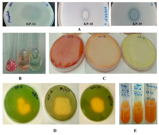 Evidence of different plant growth promoting (PGP) attributes for selected isolates KP14, KP18, and KP19: (A) phosphate solubilization, confirmed by the clear halo around the culture; (B) IAA production, confirmed by the pink color development in the reaction mixture; (C) HCN production (brown color development in the picric acid-soaked filter paper); (D) siderophore production, confirmed by yellow halo on CAS agar plates; and (E) ammonia production, confirmed by the brown color development in the reaction mixture.