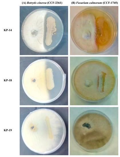 Antagonistic activity of selected isolates KP-14, KP-18, and KP-19 against (A) Botrytis cinerea (CCF-2361) and (B) Fusarium culmorum (CCF-1745).