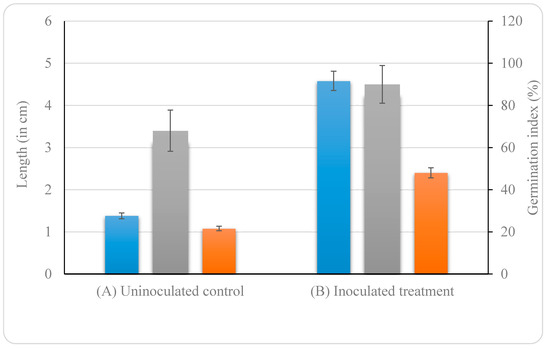 Effect of B. altitudinis KP-14 on germination of Brassica alba seeds: (A) uninoculated control and (B) inoculated treatment. Displayed data is the mean ± SE value of five replicates of each treatment. (