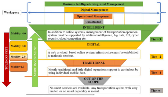 The reference model is designed as a 4-tier model, including “out of scope”, “traditional”, “digital” and “intelligent”. Each tier indicates the level of smartness. Traditional systems are transforming themselves to digital ones, and digital services are transforming to autonomous systems, which are capable of self-decision making and performing operations with no or little human intervention. Especially, with the rise of industry 4.0 (see [8] for more information), mobility 4.0 becomes a key issue in digital transportation. This is to enrich transportation services with intelligent capabilities and provide solutions to public problems with artificial intelligence technologies (see [9] for more information). In the reference model proposed, if no need emerges for a digital application, it is considered as an “out of scope” case. If the respective operations and services are running with no or little digital support, it considers that services run on a “traditional” level (Mobility 1). If the respective transformation services are conducted with fully or highly significantly digital processes, then, the system level is upgraded to “digital” level (Mobility 2 and Mobility 3) and last but not least, enriching the services with intelligent capabilities transform themselves to “intelligent” level (Mobility 4).