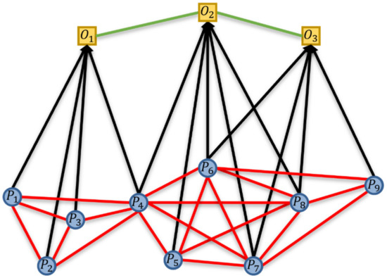 In Figure 1, the squares in the upper part are the objects (denoted by ), while the circles below are the participants (denoted by ), and the edges in black belong to the two-mode network. It is more than common to project a two-mode network onto one kind of node, and the resulting edges have been granted the property to reflect a certain relationship. As we can see, the edges in red or green coming from the projection of two black edges constitute two one-mode networks, namely Complete Object Subgraph and Complete Participant Subgraph. Sometimes, there should be weights on the edges, which are gained through the definition of co-occurrences and used to measure the potential relationship of two participants in the same object, or that of two objects in the same participant. For instance, we can quantify the relationship between two scientists (participants) by the number of papers (objects) they wrote together; similarly, we can also quantify that of two papers (objects) by the number of the same scientists (participants) they have [22]. However, refined calculation on the weight of a projected edge is very difficult, and we must use a specific method to solve a specific problem.