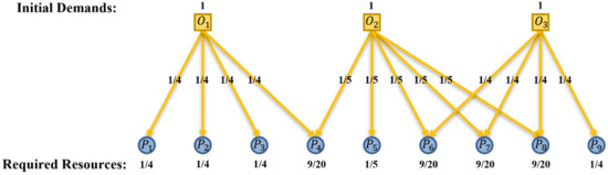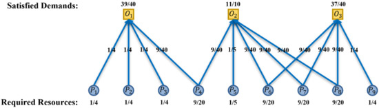 Secondary distribution: required resources from participants are equally allocated to objects. Notes: When a participant equally allocates its required resource to relevant objects, the secondary distribution depends on the number of relevant objects. Thus, the new amount of object’s satisfied demand is equal to the sum of required resources back from all its participants, e.g., .