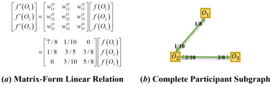 Collaborative relations reflected by complete participant subgraph. Notes: In (a), the matrix represents the linear relation between each object’s satisfied demand and initial demand, whose different values reflect their different status in the resource allocation process. Therefore, the weighted and directed graph in (b) embodies the unsymmetrically and unequally collaborative relations among three objects, while the values on the diagonal of matrix are useless. For example, according to Equation (5), the strength of cooperative relation from node to node is .