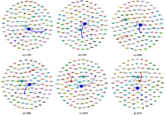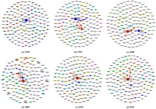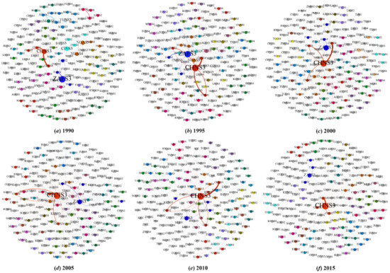 Before doing this, we need to extract three sub-networks out of the GVICN–Eora26 model, i.e., GIVCN–Eora26–AS, GIVCN–Eora26–EU, and GIVCN–Eora26–AF, reflecting the ICIO relations between China and other economies, respectively. Their brief topological structures in six different periods are as shown in Figure 5, Figure 6 and Figure 7.