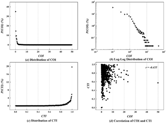 As the counterparts of CSI and CWI, we are interested in the distribution and correlation of COI and CTI. As shown in Figure 8, the heavy-tailed distribution of COI for all sectors in GPCCN–Eora26–2015 also follows the levy-stable distribution, but that of CTI is mainly concentrated in a narrow numerical range. The heterogeneity of COI and the homogeneity of CTI together result in no strong correlation between them (Pearson correlation coefficient is only −0.435).