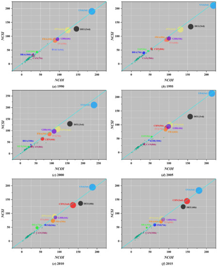 Correlation of NCSI and NCOI in GPCCN–Eora26 models. Notes: We use different colors to distinguish the top 10 nations in GDP in each year. In addition, the size of each point is proportional to the GDP of the corresponding nation.