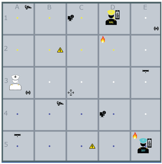 In a naval military context, “blanket search” is a damage assessment and repair procedure for incidents and malfunctions on a ship. A team of naval personnel performs a round, and each member is assigned a route along a series of compartments. Incidents, such as a fire, need immediate counteraction. Malfunctions, such as a failing energy system are often solved after incidents have been resolved. Typically, specialized engineers are assigned to routes that contain systems within their area of expertise to ensure that malfunctions are solved effectively and efficiently. Figure 1 shows the simplified simulation of the blanket search task that we developed, involving team members that are able to solve every incident and malfunction, albeit with varying degrees of efficiency resulting from differing skill levels.