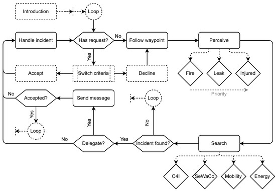 The agents are programmed to have a task model, including how repair time is affected by skill level. In addition, agents also have a mental model that includes information about the skill levels of the other agents. Furthermore, their mental models include the location of a task that was reassigned to them. The implemented behavior protocol for the autonomous agents is shown in Figure 2.