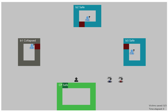 Figure 4 shows an example of the simulated USAR-task that was created. The goal is to find victims in buildings and bring them to safety in the command post. Team members have to collaborate in order to clear rubble in front of a building, establish whether it is safe to enter a building, establish whether a victim needs treatment, treat victims, and carry them to the command post. The skills and skill levels of the team members differ significantly, depending on their role within the team. Only a rescue worker (human) can establish whether a victim needs first aid, and provide it when necessary, while only explorers (agents) are able to clear rubble in front of building entrances, and can enter collapsed buildings. Robot agents also have a battery that needs to be replaced by a human agent.