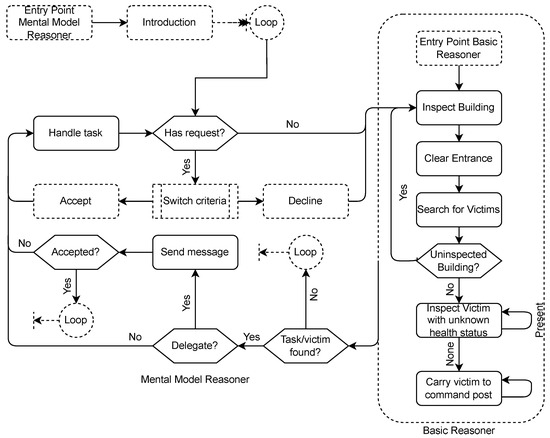 There is evidence that having accurate mental models of each other’s competences and shortcomings is vital for team performance [20,21] and for efficient and cooperative human–robot interaction [22,23]. When human individuals are collected to become a team, they generally have some basic knowledge about the context, the task, and the team. They develop, correct, and refine their mental models through experience and team communication [24,25]. How this process culminates in a mental model is difficult to determine precisely. In fact, humans themselves are often not consciously aware of what and how they learn from experiences [26]. Humans may unconsciously select features from a team task experience and use these to refine their mental model [27]. This implies that the human may also select characteristics that are not or only partially related to the task. For example, a human may notice that two team agents often follow each other, and may record in its mental model the deduction that the two are friends. This assumption may affect the human’s behavior, perhaps without consciously realizing it. Or, another example, the human may notice that a particular team member has a preference for a certain location in the scenario. The examples point out that the specific information humans extract from experiences cannot be predicted exactly, or how they will use this to update their mental model. This is different when we consider the development of the knowledge representation of an agent [28]. When an agent is programmed to act as member of a team, it too is initially programmed with basic knowledge about the context, the task, and the team. In contrast to humans, the way how agents develop, correct, and refine their knowledge representation from experiences is precisely defined in the computational source.