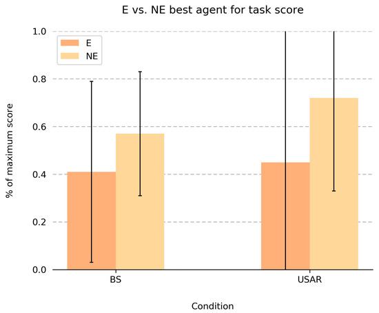 Means and SDs for the score ratio of participants when choosing the best agent for each task in the blanket search (BS) and urban search and rescue (USAR) use-cases. Ratios are compared between groups working with explaining (E) agents and working with non-explaining (NE) agents. The main effect of task (BS vs. USAR) is significant at = 0.05.