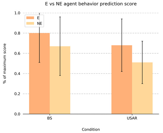 Figure 9 shows the mean score ratios for the questions in which participants predict the task request and response behavior of the robot agent team partners. On average, scores were high (74% of total score for the BS task, and 60% for the USAR task), indicating that participants were quite good at predicting when an agent would request a team member to take over a task, and how this agent would reply to task requests of others. Although the difference between task type was not statistically significant, there is a significant effect of explanation condition on the agent behavior prediction score. That is, the prediction scores were significantly higher after collaborating with agents that explained their task request/respond behavior (M = 0.74, SD = 0.28) than after collaborating with agents that did not provide explanations (M = 0.59, SD = 0.25). This same effect was found within the BS and USAR case (i.e., there was no interaction effect between explanation condition and task type). Interestingly, participants reported a high certainty of agent behavior predictions (average of 3.44 out of a 5-point Likert scale), and these certainty scores did not differ between explanation conditions, or between task types. We however found a small, but statistically significant effect between order and explanation condition for the certainty ratings on the behavior prediction questions (Certainty of agent behavior predictions): for the BS task, on average, people were more certain of their behavior predictions for NE-agents when they first collaborated with E-agents. For the USAR task, this effect was reversed; on average, people were more certain of their behavior prediction for E-agents when they first collaborated with NE-agents.
