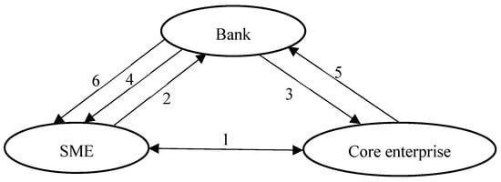 - When the bank decides not to lend to the SME, the SME unilaterally breaks the contract. That is, the strategic combination of the bank, the core enterprise, and the SME is (no lending, no joint loan fraud, break the contract). At this time, the three-party income expressions of the bank, the core enterprise and the SME are , , , respectively.