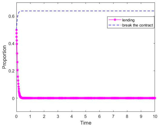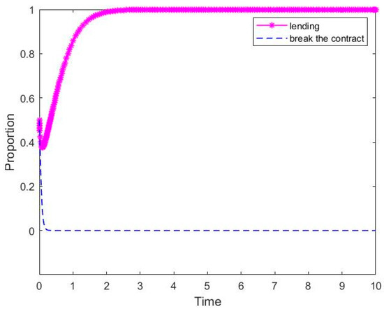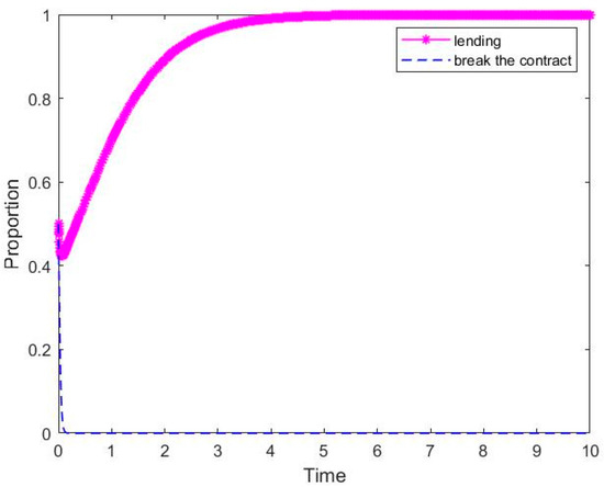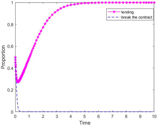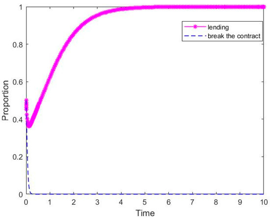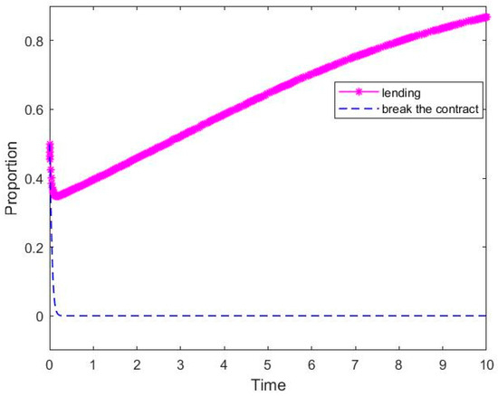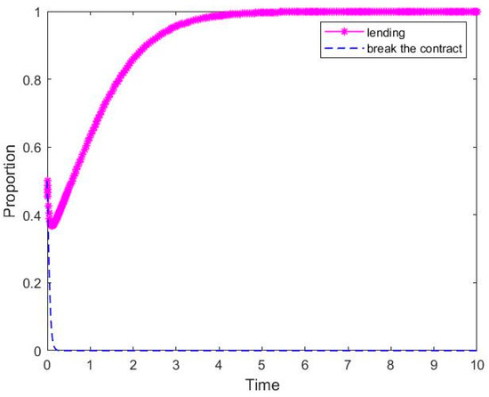 - The higher the rate of return during normal production of the SME, the more profits it obtains through normal production. The SME will be more inclined to keep the contract. This is consistent with [30,31]. That is, the system will tend to evolve in the direction of (lending, keep the contract). As the SME can obtain more profits through production, there is no need to conduct default operations;