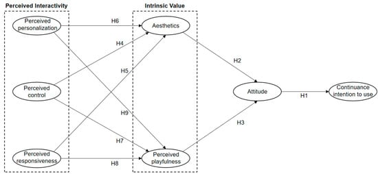 Because attitudes are perceived as the intrinsic experiences of individuals that influence consumer intentions, it is essential to understand what type of “intrinsic” influences attitudes. In the context of this study, control, responsiveness, and personalization will ultimately affect attitudes and intentions. According to Section 2.2, control, responsiveness and personalization are more likely to form various characteristics of technological products in interaction [], so they need to be converted into consumers’ intrinsic attitudes and intentions by some unknown factors. The unknown factor has been interpreted differently by various scholars due to issues, such as mental imagery [], efficiency, effectiveness, enjoyment, and trust []. This study interprets this “intrinsic” as “intrinsic value” to explain the factors that affect consumer attitudes. Perceived interactivity intrinsic value, which in turn influences attitude and then intention.