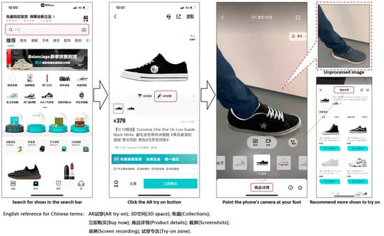 Successful implementation of AR has drawn the attention of Chinese e-commerce companies. Since 2016, major e-commerce platforms have announced or released plans and progress associated with Augmented Reality (AR/VR) []. Meanwhile, the Chinese government’s Opinions on Promoting Innovation and Transformation of Physical Retailing supports the integration, innovation, and transformation of online and offline shopping []. Despite the improvement in purchasing power in the huge Chinese market, many consumers in second- and third-tier cities have difficulty shopping in physical stores for the latest products. Moreover, due to repeated epidemic waves in the last two years [], online shopping has become increasingly popular. In order to compensate for the insufficiency of the online shopping experience, e-commerce companies are utilizing AR technology to address the problems of online shopping that are difficult to experience directly, such as the inability to try on clothing and shoes []. Moreover, due to the novelty and sense of the AR technology, many consumers are attracted to it, for example to the virtual shoe test function on the POIZON APP. Therefore, after the initial excitement, e-commerce companies should take the time to explore the inner relationship between AR functions and consumers, while at the same time shifting their focus to the perceivable value of consumers’ behavior to increase service and attract consumers better.