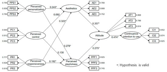 H6 is valid, indicating that consumers’ perceived personalization will positively influence their attitudes toward the perceived aesthetics of AR virtual shoe trying. H9 is valid, indicating that the perceived personalization of consumers in AR virtual shoe-try-on function will positively influence their attitudes toward the perceived playfulness. Furthermore, the validity of H6 and H9 means that the perceived personalization of consumers has a positive impact on consumers’ perceptions of the intrinsic value of the AR virtual shoe-try-on function. Consistent with our hypothesis, the AR virtual shoe-try-on function enables consumers to visualize products in relevant scenes [] and enhance their perceived personalization in real-life settings []. In the meantime, perceived personalization more significant greater impact on consumers’ perceived playfulness. Both of these characteristics tend to be perceived attributes of personal preferences and it has been found that the more personalized settings and processes there are, the more playfulness consumers will experience. Perceived playfulness, of course, is not the only factor that is affected by perceived personalization, which also has a significant impact on the process of using and interface loading of the entire AR virtual shoe-try-on function. Customers’ individual APP usage habits and the degree of optimization also influence their experience, which, in turn, affects their attitudes and intentions.