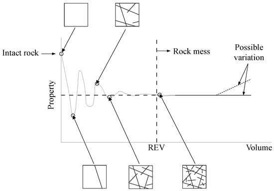 The concept of representative element volume (REV) for rock mass system (modified from []).