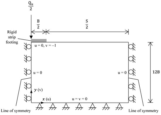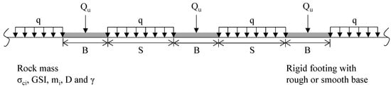 Figure 3 illustrates the geometry and parameters of the rock-footing system considered. A number of multiple strip rigid footings rest upon a rock medium with horizontal ground surface. The footings are having width B and are placed at equal clear spacing S. The interfering effect of multiple footings is quantified by the adjacent spacing ratio S/B, which ranges from 0.1 to 6. The base of the footing is considered as the perfectly smooth and perfectly rough providing upper and lower limits of capacity for multiple footings with given material properties. The rock mass obeys the Hoek–Brown failure criterion as a function of σci, mi, GSI, and D. The σci value is kept equal to 20 MPa [] and the mi values are taken as 7, 10, 15, 17, and 25 for five types of rocks []. The values of GSI and D are within the range of 10 to 90 and 0 to 1, respectively. The rock mass has unit weight γ, which is quantified by σci/γB. The value of σci/γB varies from 125 to ∞ that indicates the weightless rock mass []. The ground is loaded with a uniform surcharge pressure q and its effect is represented by q/σci. The value of q/σci ranges between 0 to 1, which cover most problems of practical interest []. The vertical downward load is simultaneously applied to the center of each footing and all footings are collapsed exactly at the identical bearing load Qu.