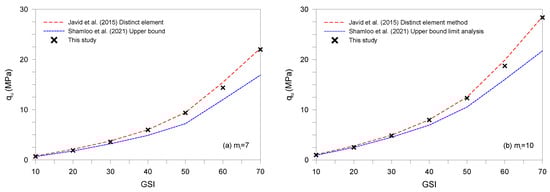 Figure 5 provides the obtained qu value of two interfering footings (S/B = 1) on rock mass, together with other numerical analysis for same footing and soil conditions. The Figure 5 shows the variation of qu values with GSI for the case of mi = 7 and 10. As shown in the Figure 5, the results of the numerical analysis are very close to those obtained with distinct element method of Javid et al. []. However, the value of qu in upper bound solutions by Shamloo et al. [] was under-predicted, and the difference increases with increasing GSI. Given that the result of present study is included in the result of Javid et al. [] and Shamloo et al. [], it can be seen that agree well with previous study.