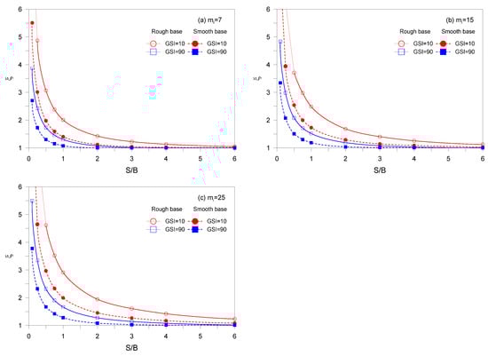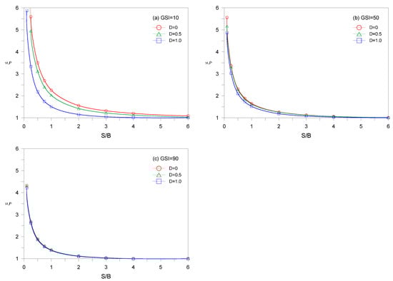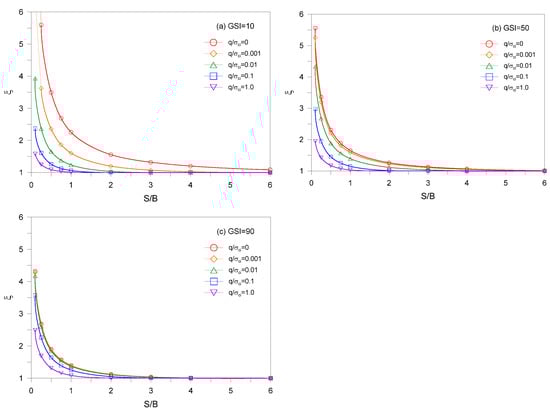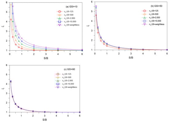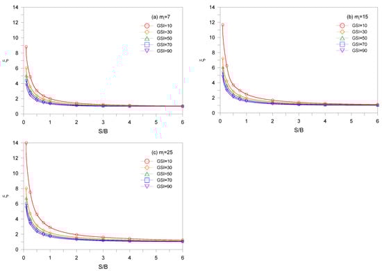 The variation of the efficiency factors ξ for different combinations of S/B and σci/γB is shown in Figure 9 for the case of mi = 10, D = 0, q/σci = 0 and GSI = 10, 50, and 90. Figure 9 shows that the greater σci/γB for a given value of σci/γB, the greater the value of ξ. However, it should be noted that the smaller GSI, the significant the difference in the value of ξ according to σci/γB, but the greater GSI, the smaller the difference in the value of ξ. This indicated that for the case of GSI = 90, the unit weight of rock mass has little effect on the value of ξ of multiple footings. In addition, as GSI decreases, the efficiency factor of σci/γB except 125 decreases. For the case of σci/γB = 125, the value of ξ increases slightly when GSI increases from 10 to 50, but when it is greater than 50, the value of ξ decreases.
