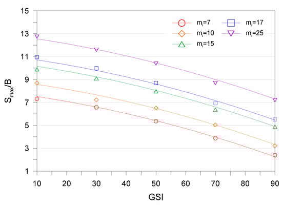 The variation of Smax/B for different combinations GSI and mi is shown in Figure 7 for the case of D = 0, σci/γB = infinite, q/σci = 0. Figure 7 shows that Smax/B decreases with increasing GSI, but for a given GSI, Smax/B increases with increasing mi. It should be noted that the maximum value of Smax/B is 12.76 for GSI = 10, mi = 25 and the minimum value of Smax/B is 2.41 for GSI = 90, mi = 7. In addition, the Smax/B can be described as exponential function of GSI. Expressed in terms of the Smax/B: