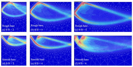 Failure mechanisms of multiple strip footings for GSI = 30, mi = 10, D = 0, σci/γB = ∞ and q/σci = 0 with different combinations of S/B and base roughness: smooth base with (a) S/B = 2; (b) S/B = 4; and (c) S/B = 6; rough base with (d) S/B = 2; (e) S/B = 4; and (f) S/B = 6.