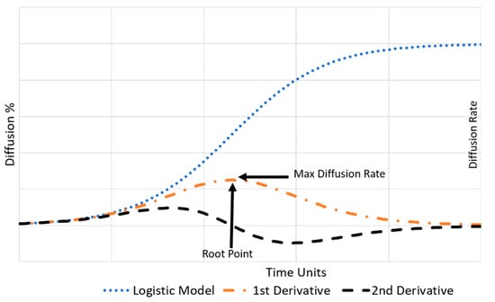 To ascertain the maximum diffusion rates of the technological innovation data collected, first, each dataset was fitted to each model under study. The maximum diffusion rate for each technological innovation dataset was then extracted via math-based analysis. The first derivative of the fitted base function gives the diffusion rate at any point in the curve as the slope of the resultant tangent line. Moreover, the second derivative yields the rate of change of the diffusion rate at any instant on the curve. Consequently, each fitted model’s maximum diffusion rate was extracted by determining the root point of the model’s second derivative, representing when a technological innovation’s diffusion rate has peaked, as graphically illustrated in Figure 1. The derivatives of the logistic model and Bass model are presented in Table 1 and Table 2, respectively, for reference.